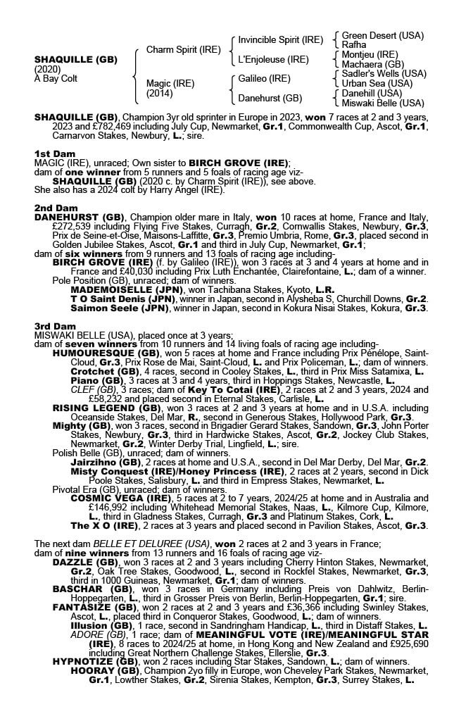 Shaquille hails from the famed Green Desert sire line that has produced no end of extraordinary stallions, including Kingman, Oasis Dream and Shaquille’s own grand-sire Invincible Spirit. His dam Magic is by the legendary Galileo, out of the Champion mare Danehurst, a daughter of breed-shaper Danehill.